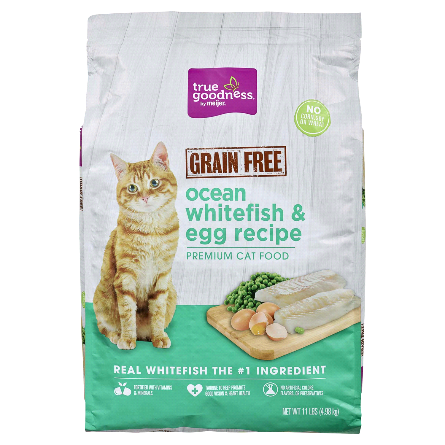 Made with real whitefish and has no corn, soy or wheat. Also has no artificial colors, flavors or preservatives. Include fortified vitamins and minerals.