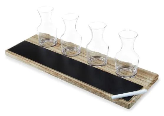 Indulge in an evening of wine tasting with this elegant Wine Flight set. This set includes four 7.44 oz. glass carafes, and a lightweight but sturdy wooden flight board so that you can transport and e…
