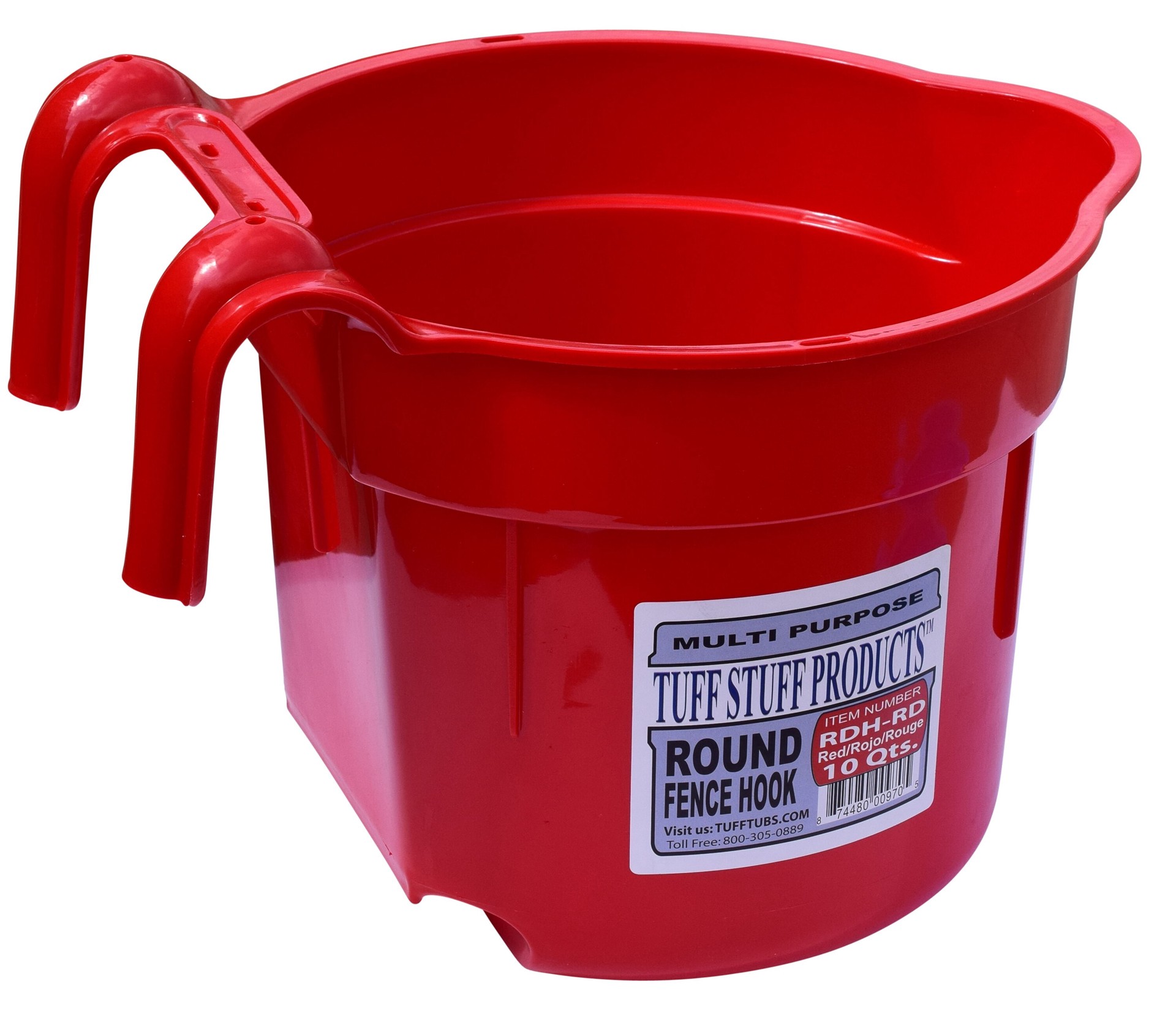This Round Hook Over Bucket holds up to 10 qt Safe containment of animal feed and water.. Heavy Duty Plastic, Heat, Cold, UV, Impact Resistant, is ideal to hang over a 2in wooden corral bar or 2 in pi…