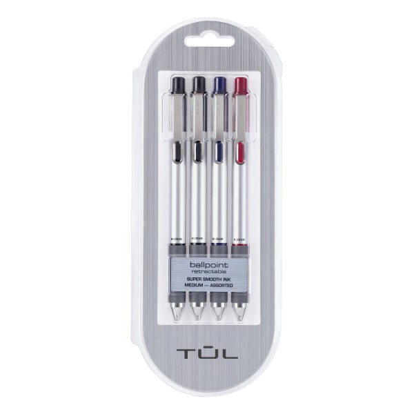 TUL Bp3 Retractable Ballpoint Pens, Medium Point, Silver Barrel, Assorted Ink Colors, Pack Of 4 Pens