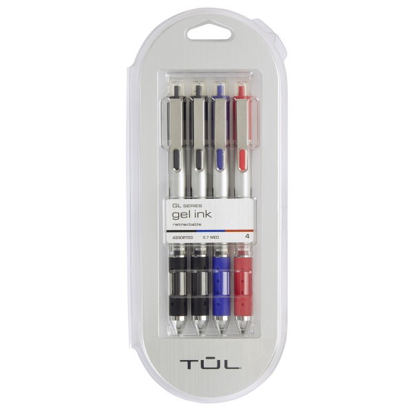 TUL Retractable Gel Pens, Medium Point, 0.7 Mm, Silver Barrel, Assorted Inks, Pack Of 4 Pens