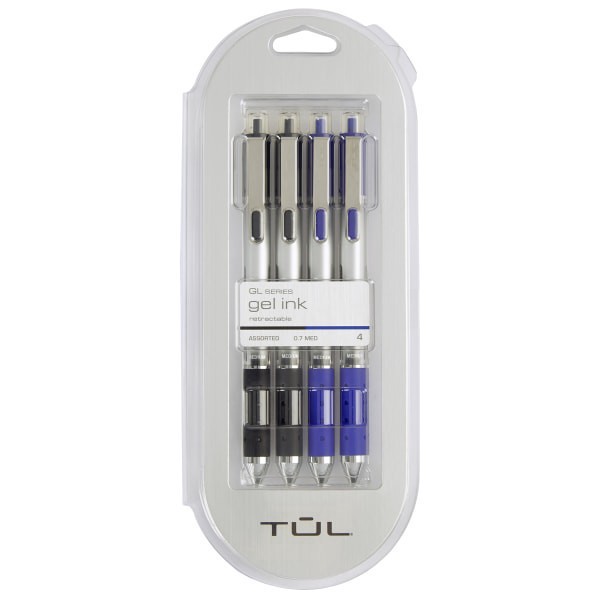 TUL Retractable Gel Pens, Medium Point, 0.7 Mm, Silver Barrel, Black And Blue Inks, Pack Of 4 Pens