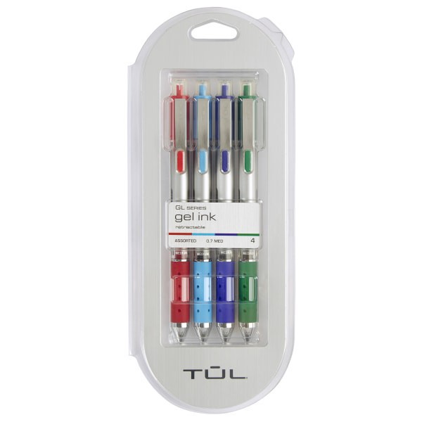 TUL Retractable Gel Pens, Medium Point, Silver Barrel, Assorted Inks, Pack Of 4 Pens