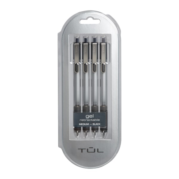 TUL Retractable Gel Pens, Medium Point, Silver Barrel, Black Ink, Pack Of 4 Pens