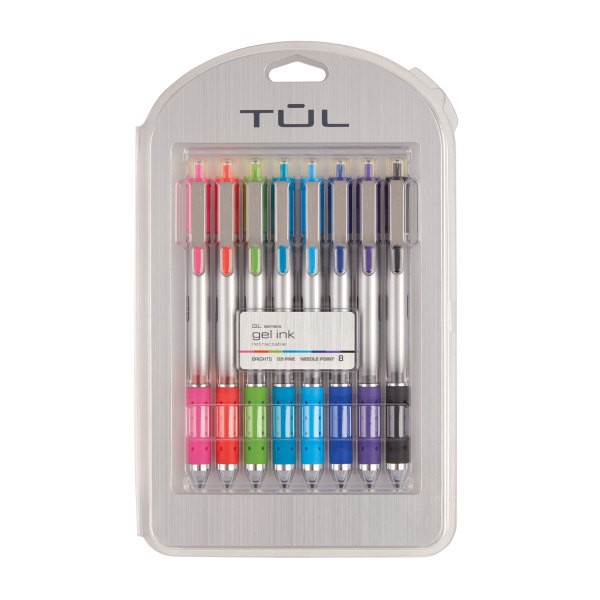 TUL Retractable Gel Pens, Needle Point, Silver Barrel, Assorted Bright Inks, Pack Of 8 Pens