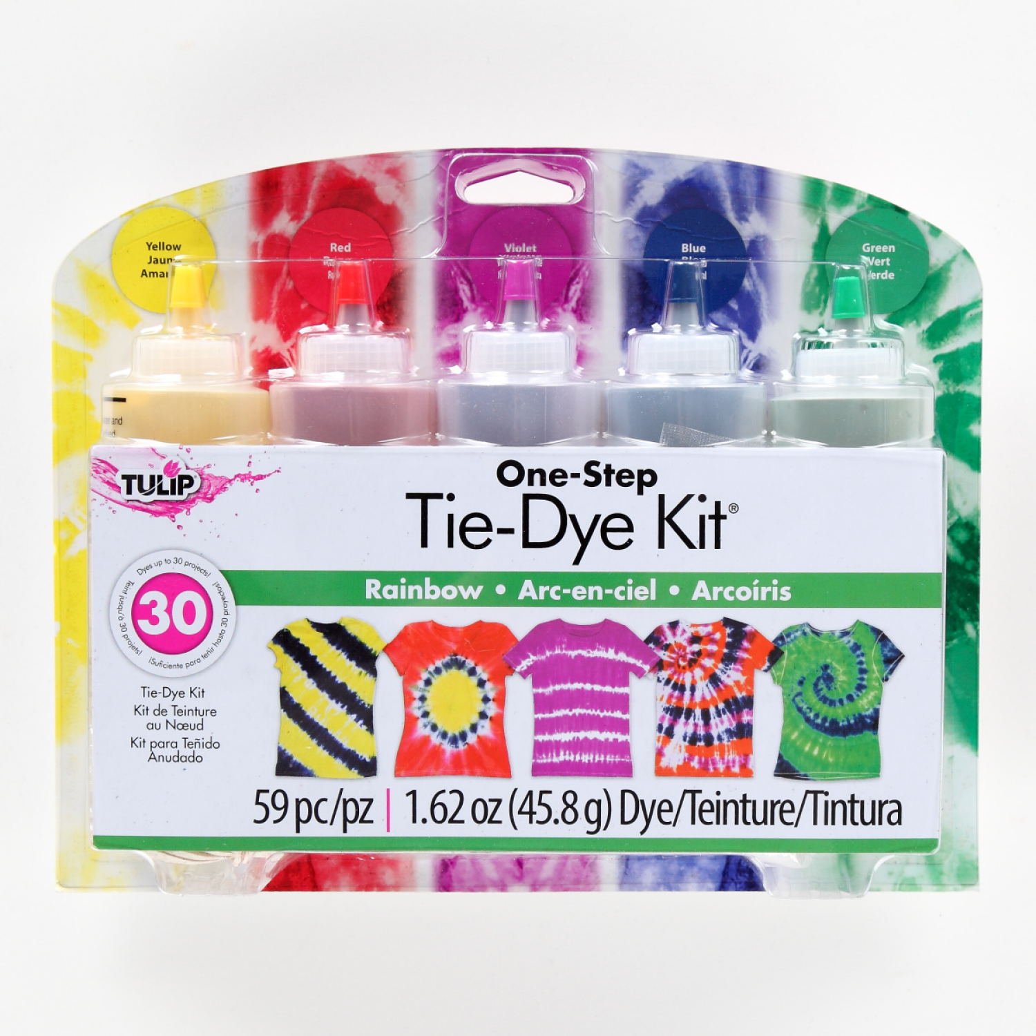 The Tulip One-Step Rainbow Tie-Dye Kit is full of colorful fun! Stocked with 5 bottles of incredibly vibrant One-Step Dye, supplies and an inspiration guide, this kit is ready for your creativity. Eac…