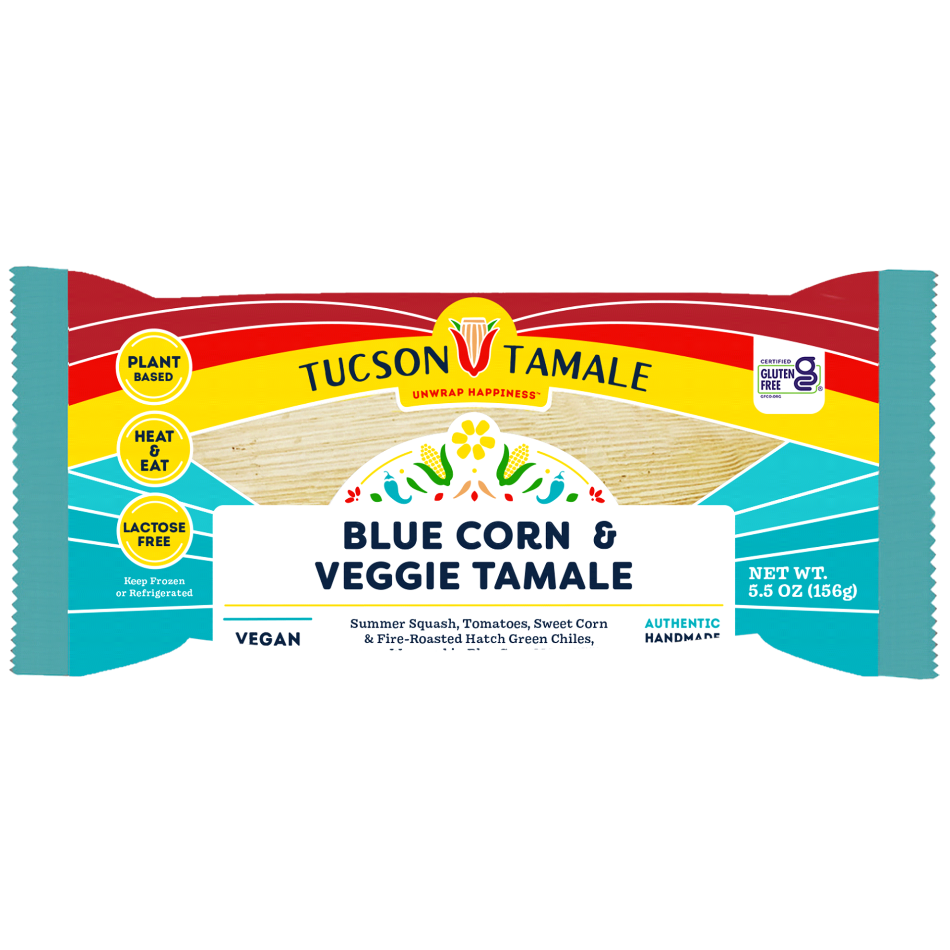 Our Blue Corn Veggie Tamales gave summer suash, organic sweet corn, tomato, and Hatch green chile wrapped inside nonGMO blue corn masa. The filling in this yummy vegetarian tamale is a traditional Me…