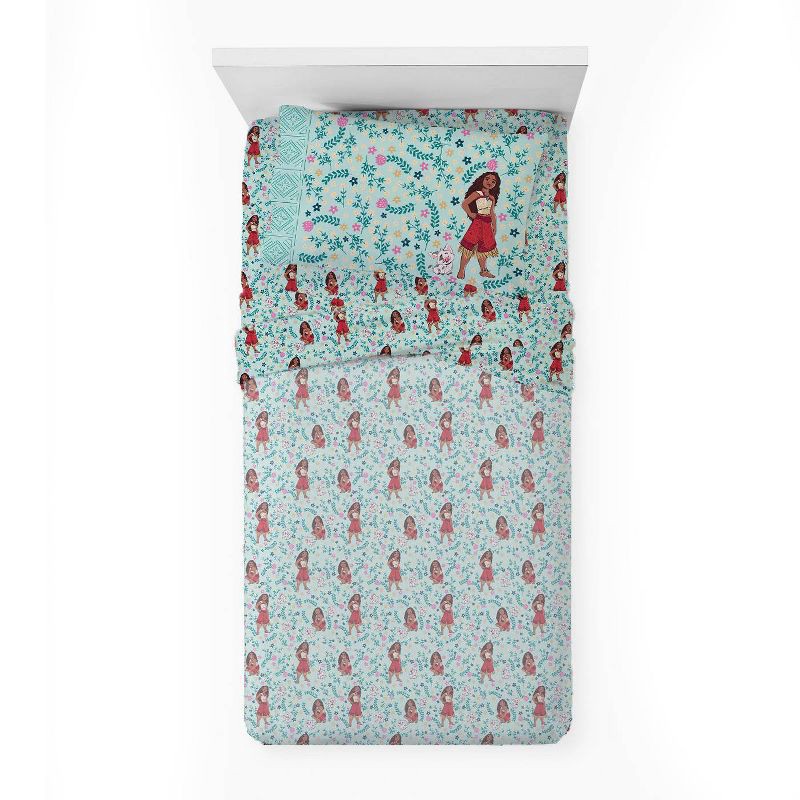 Set sail into a world of adventure with this Moana twin sheet set, featuring a flat sheet (96" x 66"), fitted sheet (75" x 66"), and pillowcase (20" x 30"). Made from 100% soft polyester, it's cozy, d…