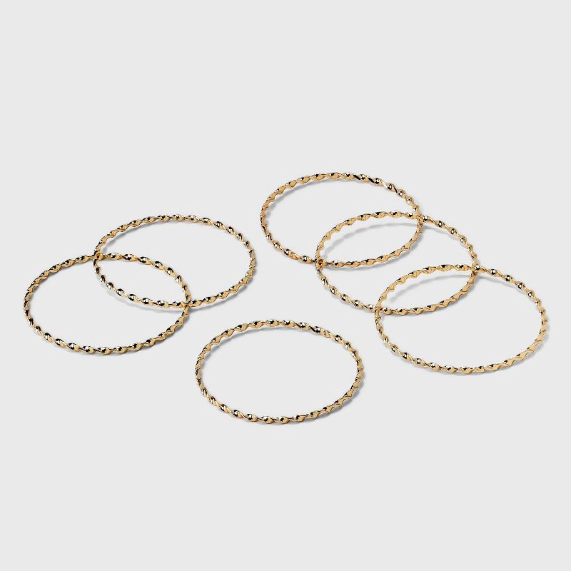 This 6-Piece Twisted Bangle Bracelet Set from A New Day™ adds beautiful texture to your jewelry collection. Each bracelet piece features a twisted bangle design in a versatile gold-tone finish and com…