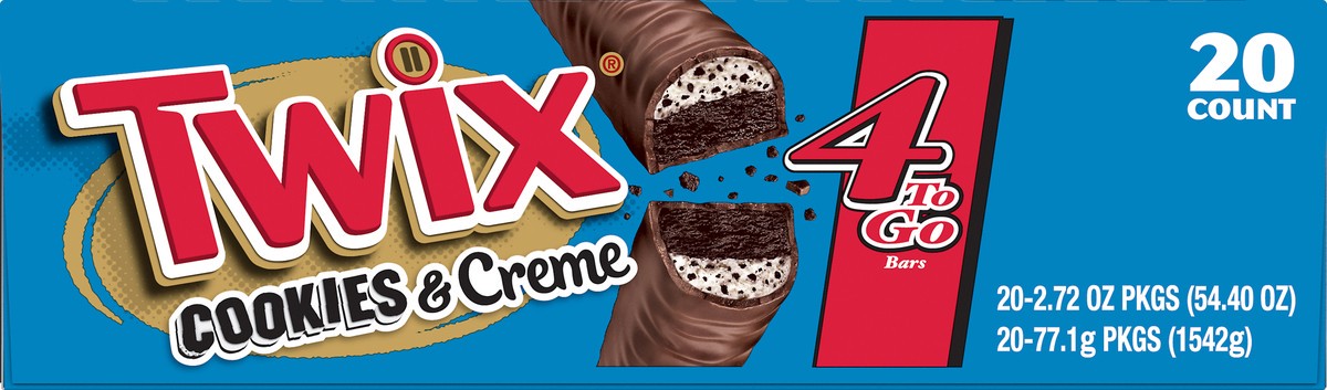 Contains twenty (20) 2.87-ounce 4 To Go size TWIX Cookies & Creme Chocolate Cookie BarsFeaturing a creme-filled center packed with cookie bits over a crunchy chocolate cookie cloaked in real milk choc…