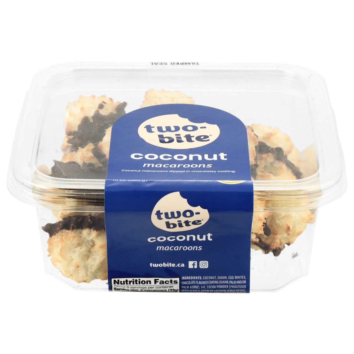 Original. www.twobite.ca. Sweet toasted coconut. Chocolate dipped. Delicious with coffee or tea. Tamper seal. Facebook. Pinterest. Partially produced with genetic engineering. Product of Canada.