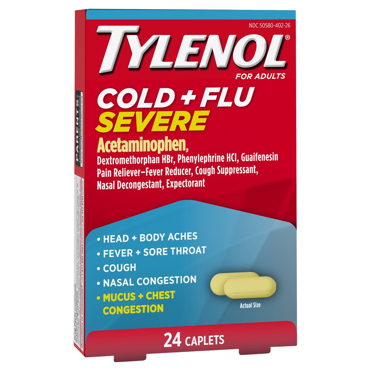 Experience temporary relief from fever, sore throat, headache, nasal congestion, cough, and other cold and flu symptoms with Tylenol Cold + Flu Severe Caplets. This powerful pain reliever and fever re…