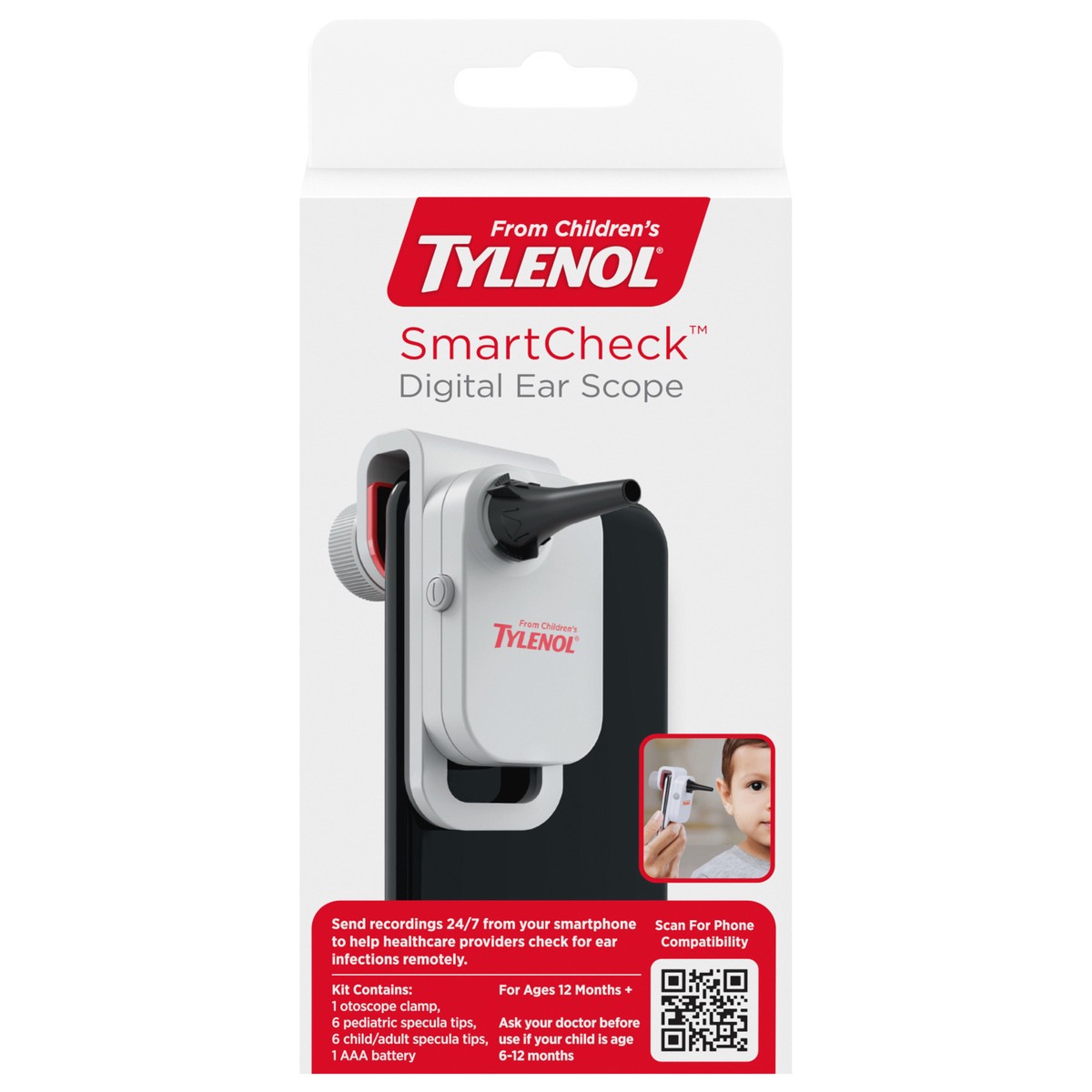 Tylenol SmartCheck Digital Ear Scope from Children's Tylenol, Otoscope with Light for iPhone, Ear Camera; Includes 1 Otoscope Clamp, 12 Specula Tips; 6 pediatric tips, 6 child/adult tips