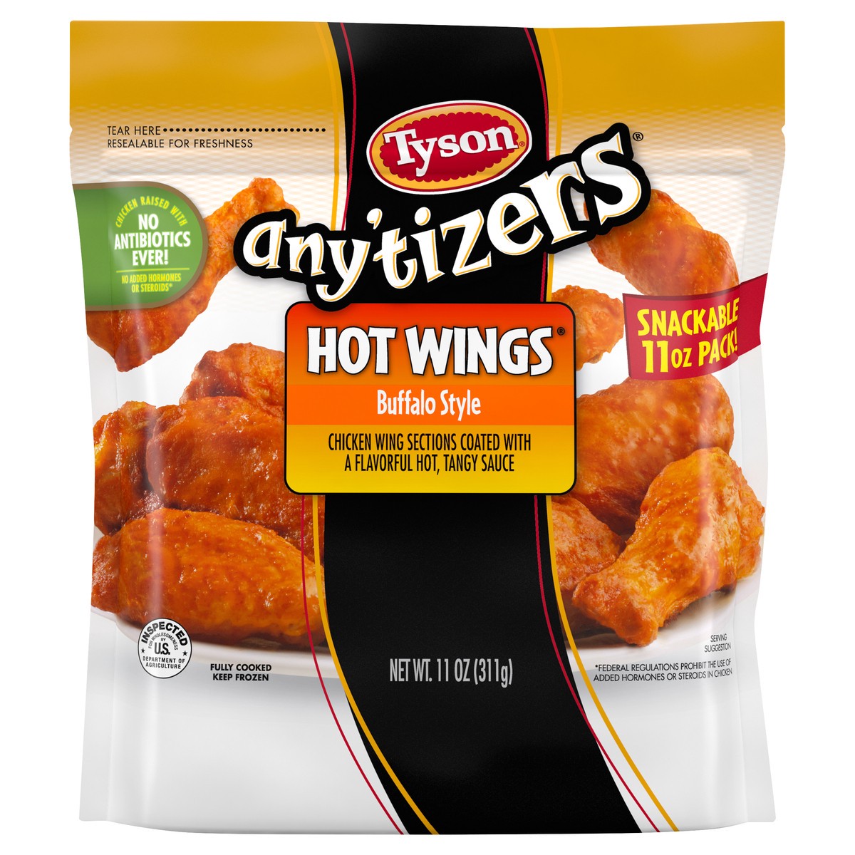 Take snack time to the next level with Tyson Any'tizers Buffalo Style Bone-In Hot Chicken Wings. Our breaded wings are made with bone-in chicken and covered in spicy, tangy Buffalo sauce. With 14 gram…