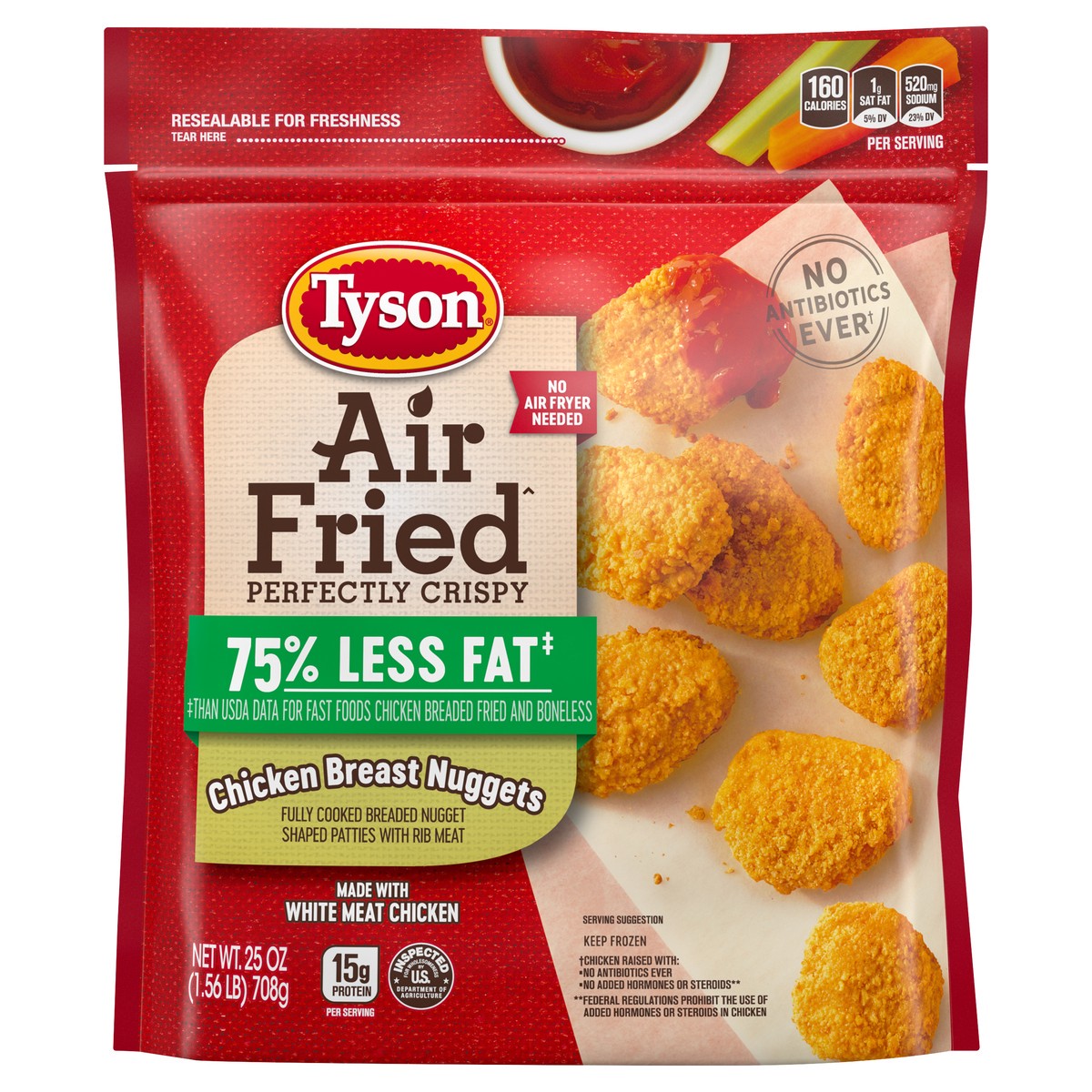 Made with chicken raised with no antibiotics ever, Tyson Air Fried Perfectly Crispy Chicken Nuggets are a delicious addition to any meal. Our chicken nuggets are made with all natural white meat chick…