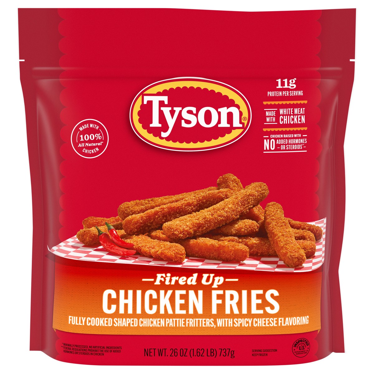 Turn up the heat on snack time or mealtime with our Tyson Fired Up Chicken Fries. Each 26 oz bag is packed with bold, spicy cheese flavor that will set your taste buds alight. Crafted from 100% all-na…