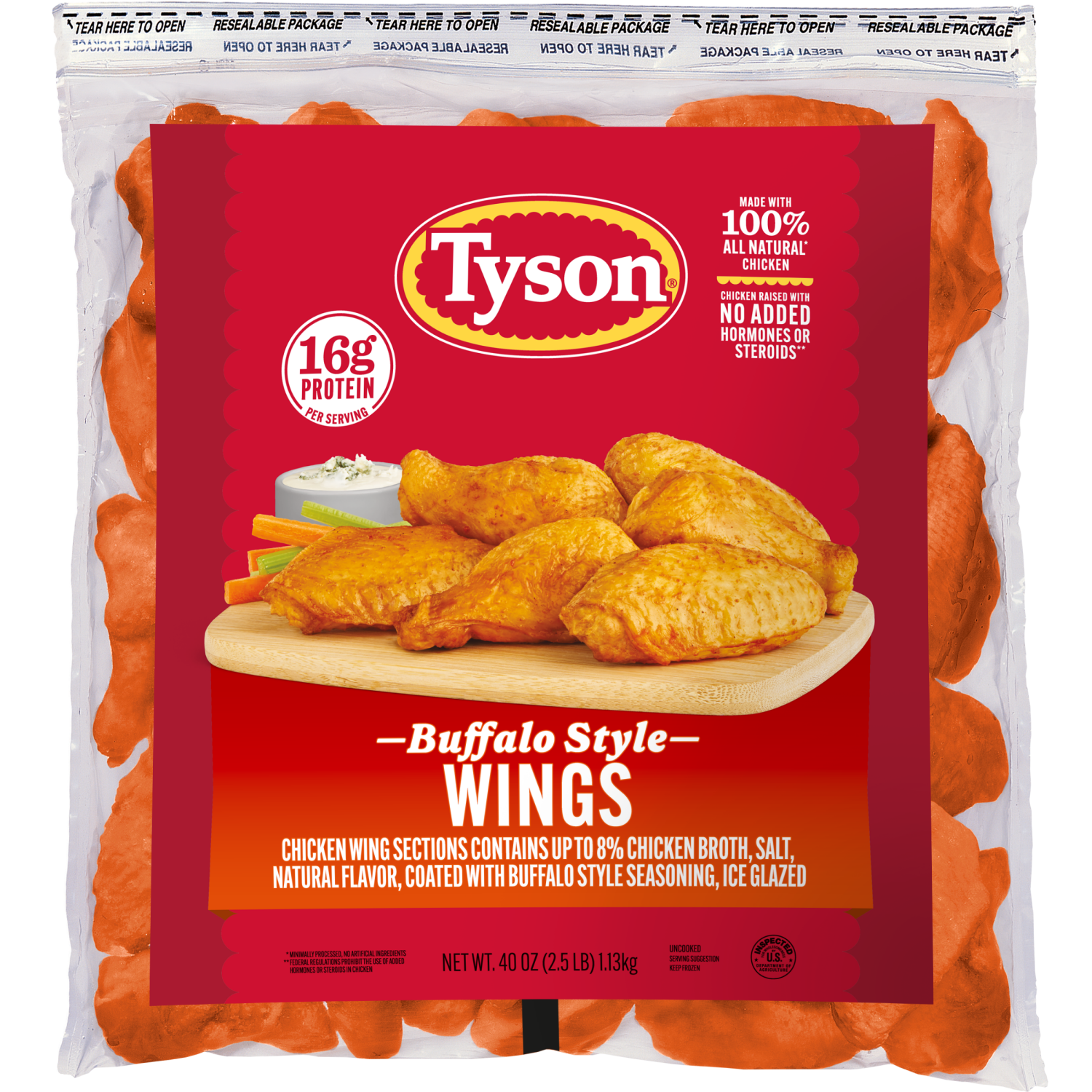 Tyson Buffalo Style Wing made with no antibiotics ever ingredients include dried red pepper sauce aged red peppers, vinegar, salt, garlic, salt, garlic powder, spices, extractives of paprika, annatto,…