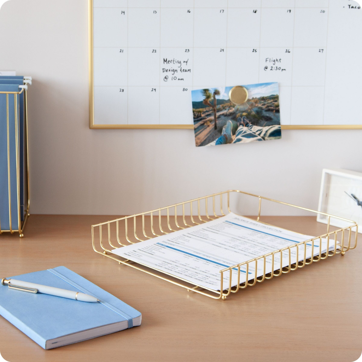 Enhance your desk with the U Brands Bent Wire Paper Tray, a stunning fusion of style and function. The elegant gold finish adds a touch of charm to your workspace, turning stacks of paper into a styli…