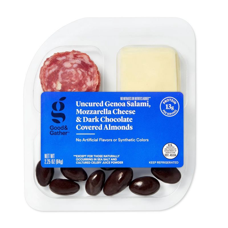 - Good & Gather salami, Mozzarella and dark chocolate-covered almonds snacker