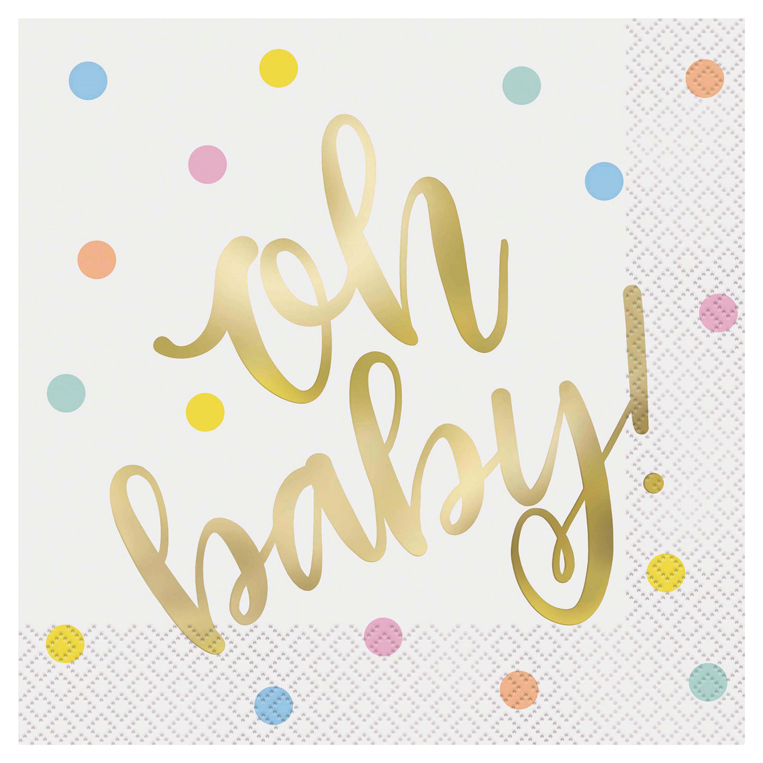 Set the table with a special shine using our Gold ""Oh Baby"" Baby Shower Napkins. These stylish 2-ply napkins feature pastel polka dots and gold foil-stamped text that's sure to stand out at your boy…