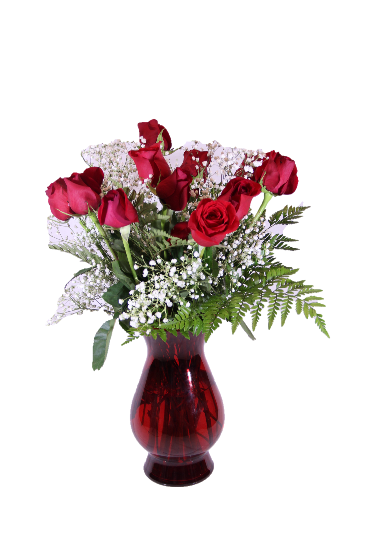 Fresh Long Stem Roses with Filler or Greens in Large Vase.