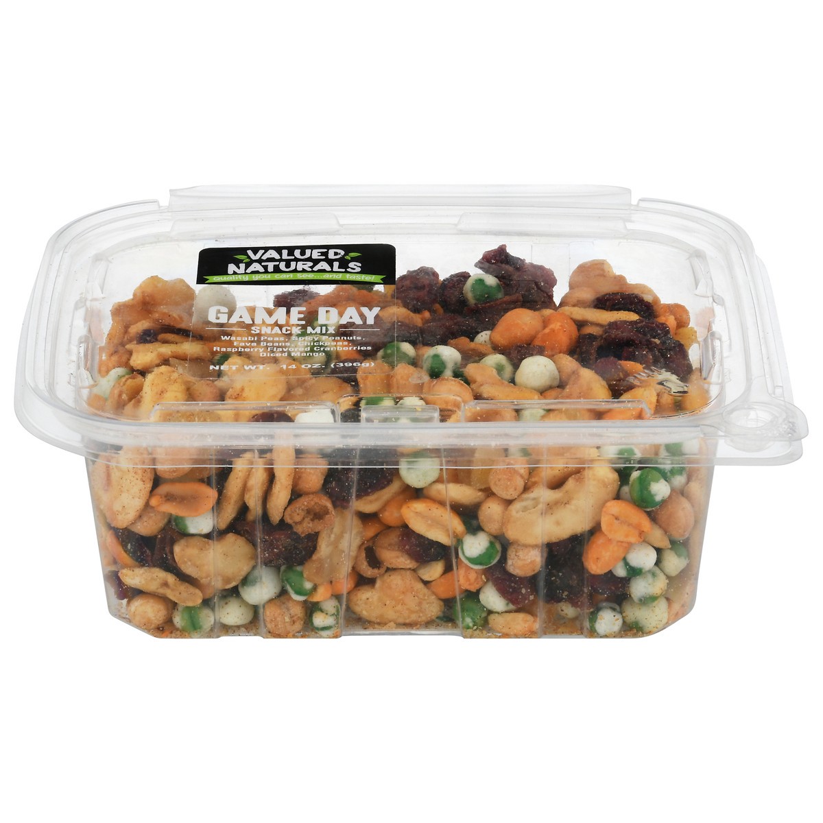 Wasabi peas, spicy peanuts, fava beans, chickpeas, rapsberry flavored cranberries, diced mango.