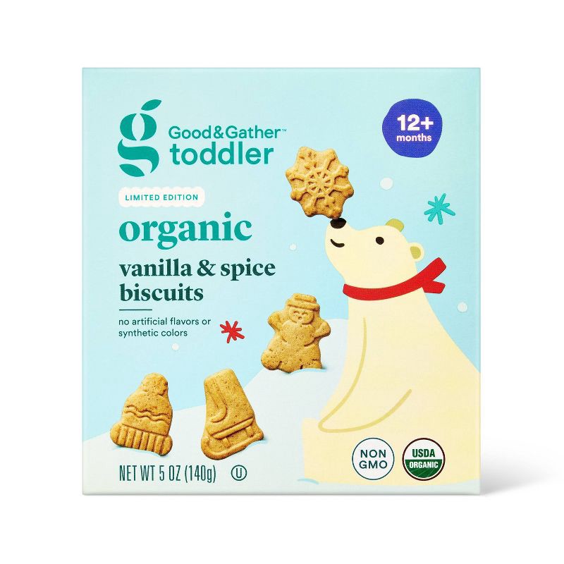 Add sweet, wintry fun to your kid's snack time with the Vanilla Spice Biscuit Baby Snacks from Good & Gather™. This organic biscuit pack is naturally flavored and comes in various shapes — boots, snow…