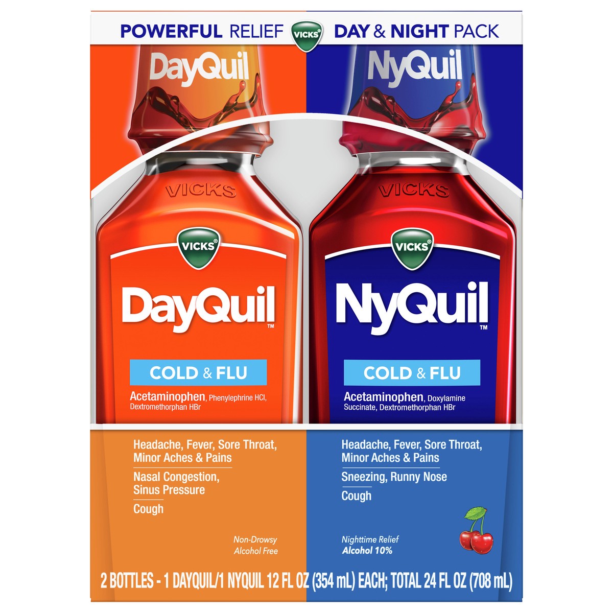 Vicks DayQuil and NyQuil Cherry Cold and Flu Relief Cherry-Flavored Liquid Medicine, Powerful Multi-Symptom Daytime and Nighttime Relief for Headache, Fever, Sore Throat, Minor Aches and Pains, and Cough, Cherry Flavored, Combo Pack, 2 x 12 FL OZ Bottles