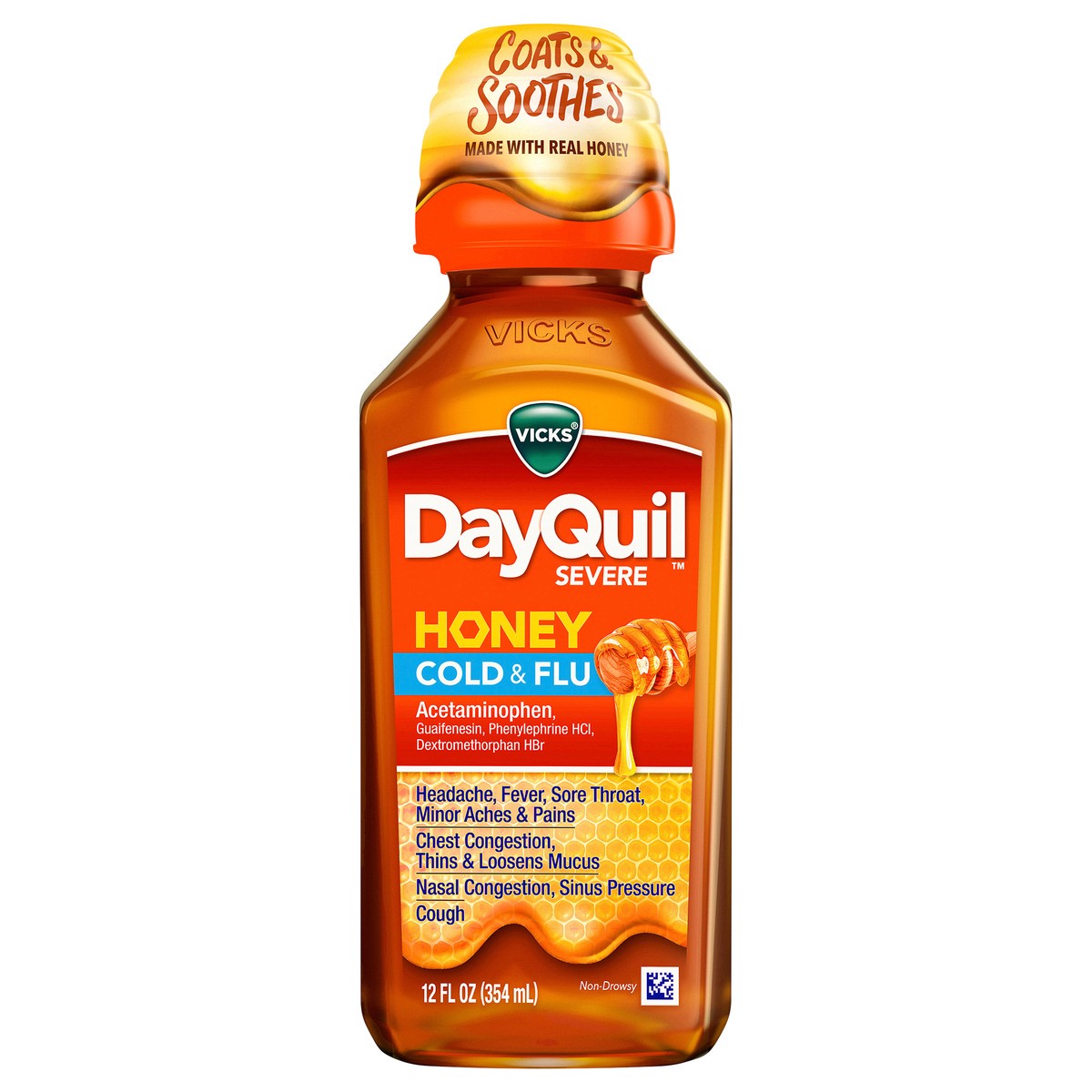 Vicks DayQuil SEVERE Honey Cold & Flu Liquid Over-the-Counter Medicine, Powerful Daytime Relief for Headache, Fever, Sore Throat, Minor Aches and Pains, Chest Congestion, Stuffy Nose, Nasal Congestion, Sinus Pressure, and Cough, Honey Flavor, 12 FL OZ