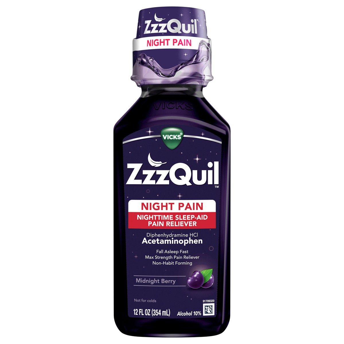 Vicks ZzzQuil Liquid, Max Strength Pain Reliever, Nighttime Sleep Aid Liquid, Acetaminophen 1000mg, Diphenhydramine 50mg HCI, Non-Habit Forming, Midnight Berry Flavored, 12 FL OZ