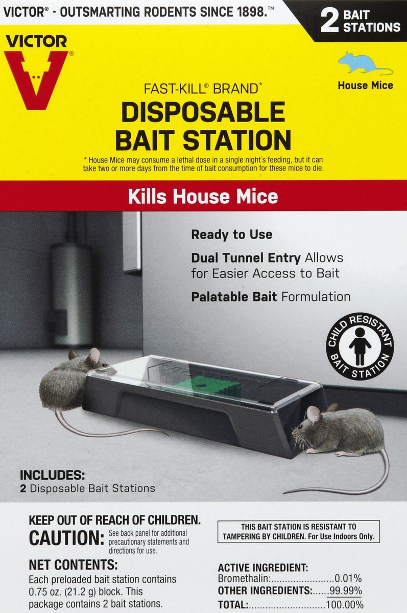 Includes: 2 disposable bait stations. Net Contents: Each preloaded bait station contains 0.75 oz (21.2 g) block. This package contains 2 bait stations. House mice. Kills house mice. Fast-Kill brand (h…