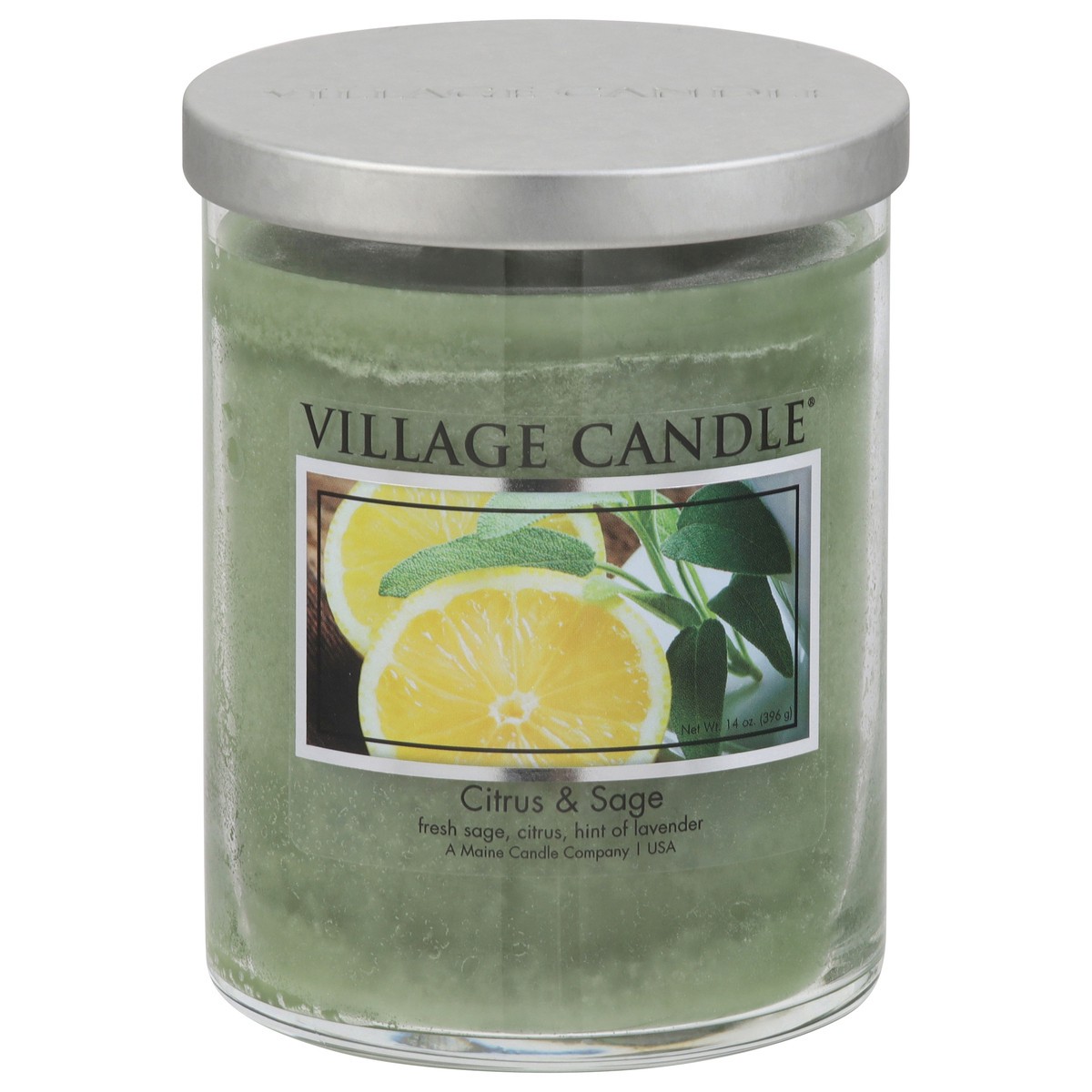 18 fl oz. Fresh sage, citrus, with a hint of lavender. Approx. burn time is up to 85 hours. www.villagecandles.com. Made in Wells, Maine USA.