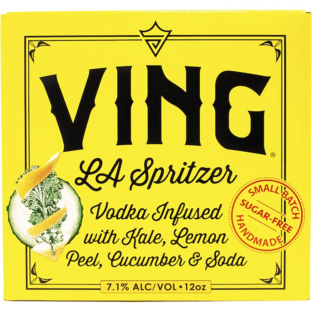 California- VING LA Spritzer; ultra-premium kale, lemon peel, and a cucumber-infused vodka soda. 100% American Non-GMO produce, free of sugar, and additives, and zero secret ingredients. Handmade in C…