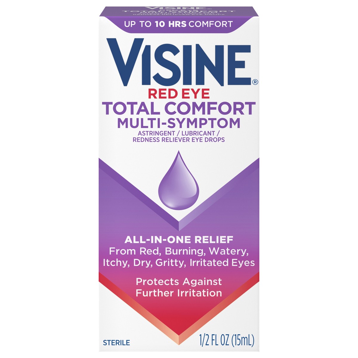 Relieve redness and soothe eyes with Visine Red Eye Total Comfort Multi-Symptom Eye Drops. This all-in-one astringent, lubricant and redness reliever helps to relieve burning, watery, itchy, gritty, d…