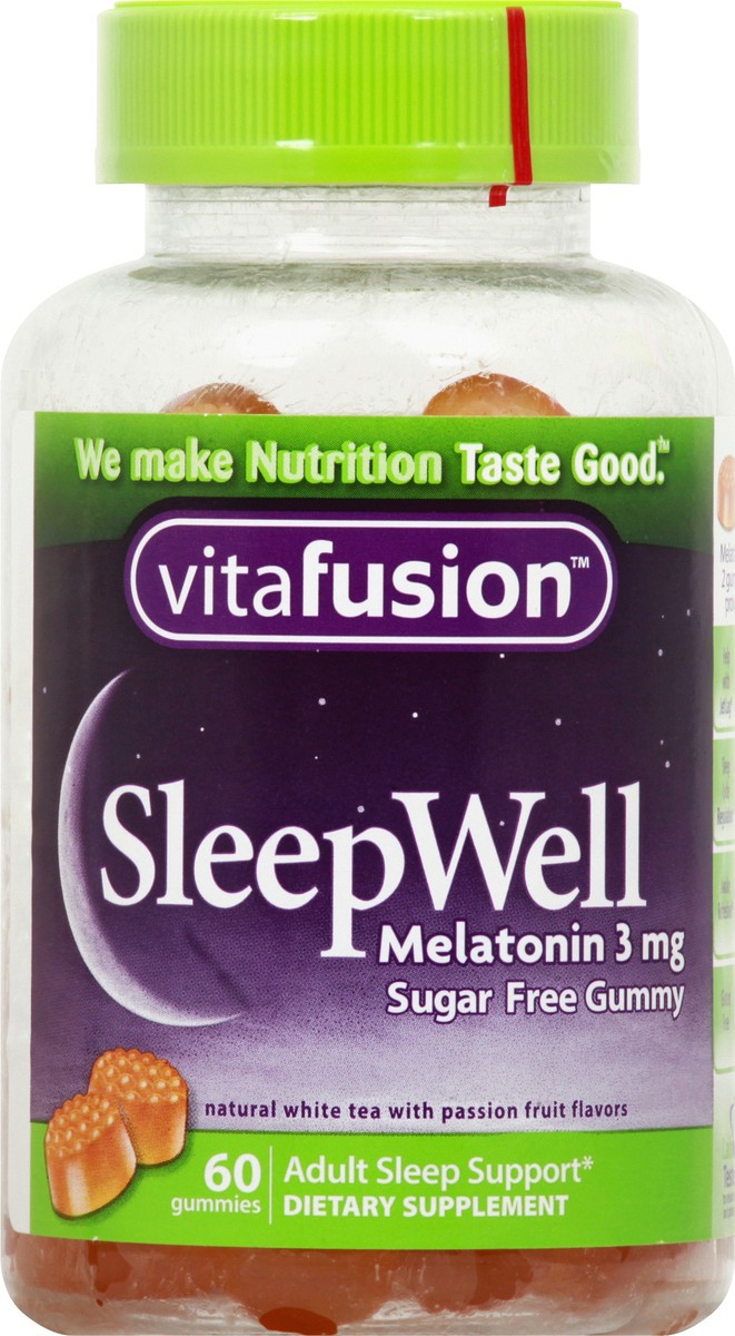 Dietary Supplement. Natural white tea with passion fruit flavors. Sugar free. Melatonin. We make nutrition taste good. Adult sleep support. www.vitafusion.com. Questions, comments? Call 1-888-334-5389…
