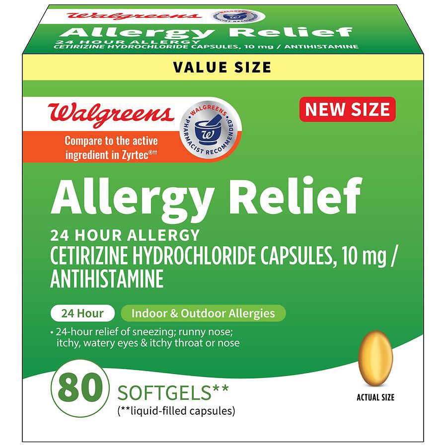Walgreens Allergy Relief softgels provide 24 Hour Relief of sneezing, runny nose; itchy, watery eyes & itchy throat or nose. Compare to the active ingredient in Zyrtec. Indoor & Outdoor Allergies. Thiā¦