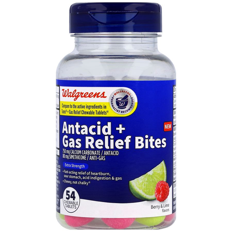 Compare to the active ingredients in Tums + Gas Relief Chewable Tablets^^ Extra strength Chewy, not chalky Fast-acting relief of heartburn, sour stomach, acid indigestion & gas. Gluten free. Walgreens…