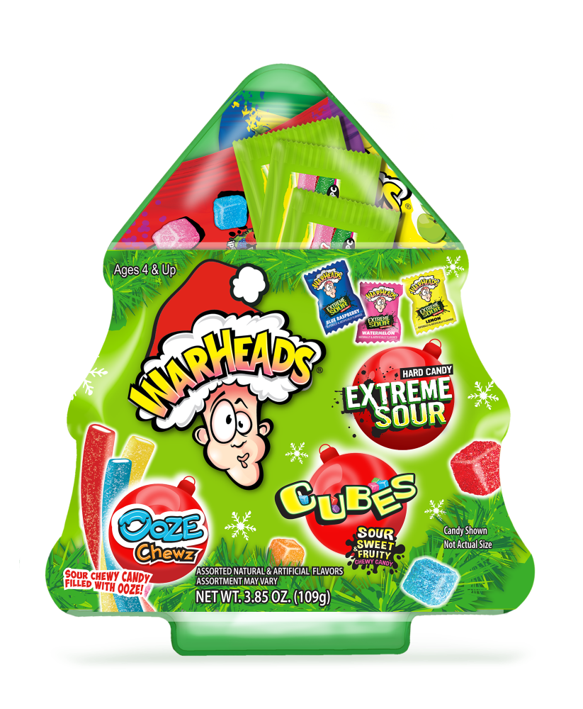 New item with 3 top-selling Warheads candies containing 3.85oz of candy: Warheads Extreme Sour hard candy, 1oz; Warheads Cubes, 2oz; Warheads Ooze Chewz sticks, .85oz.