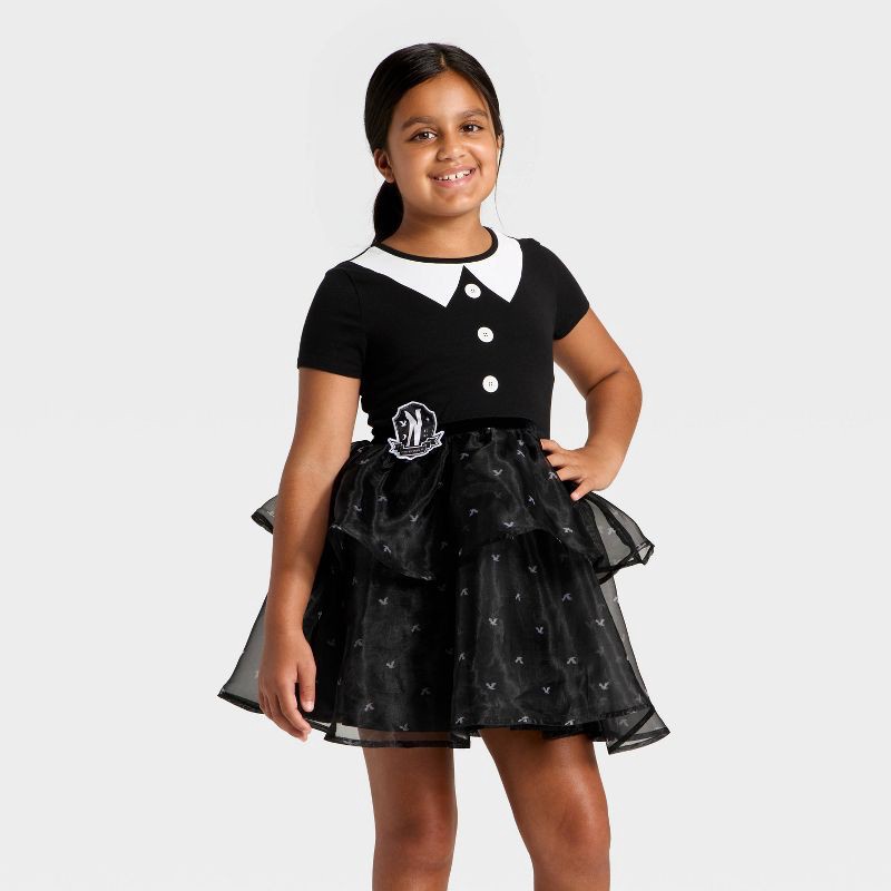 Flaunt your favorite character wearing the Girls' Wednesday Addams Tulle Character Dress in Black/White. Designed for a cute, adorable look, this charming dress features printed jersey fabric and a fl…
