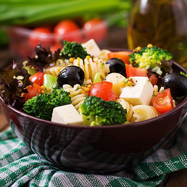 COOKED PENNE PASTA [PASTA (WHEAT), CANOLA OIL, VINEGAR, SALT, POTASSIUM SORBATE, SODIUM BENZOATE], GREEK SALAD [FETA CHEESE (PASTEURIZED MILK, BACTERIAL CULTURE, SALT, MICROBIAL ENZYME, CALCIUM CHLORI…