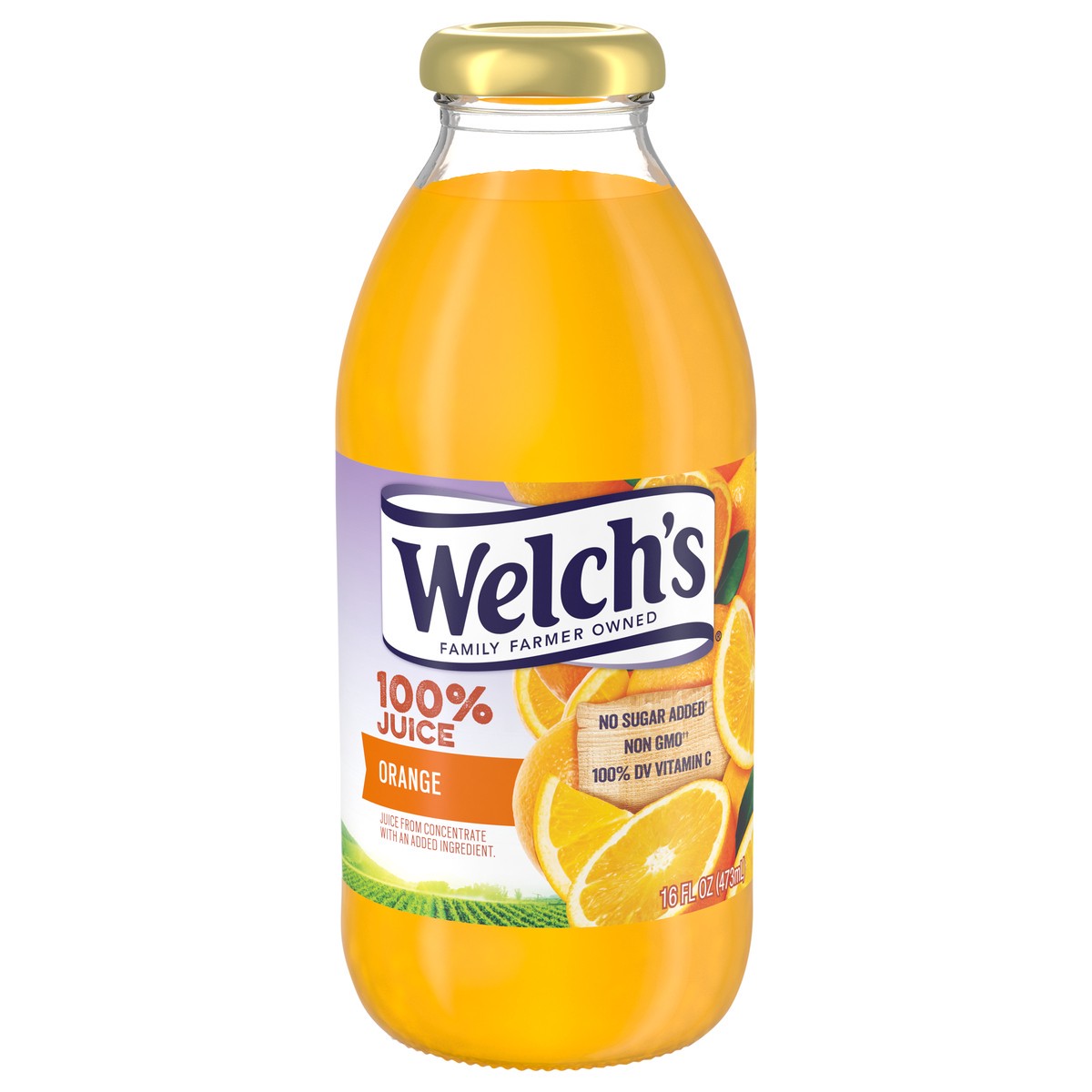 Welch's 100% Orange Juice delivers delicious taste in every bottle, in a great on-the-go- size. You can trust the goodness of Welch's: There are four servings of fruit and 100% Daily Value of Vitamin …