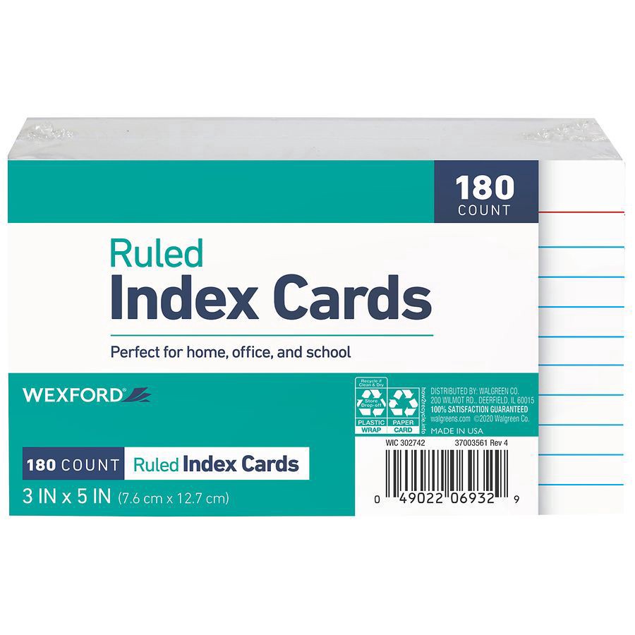 Wexford 3 x 5 Ruled Index Cards, great for school notetaking, studying, recipes and more. White, 180 per pack Made in US