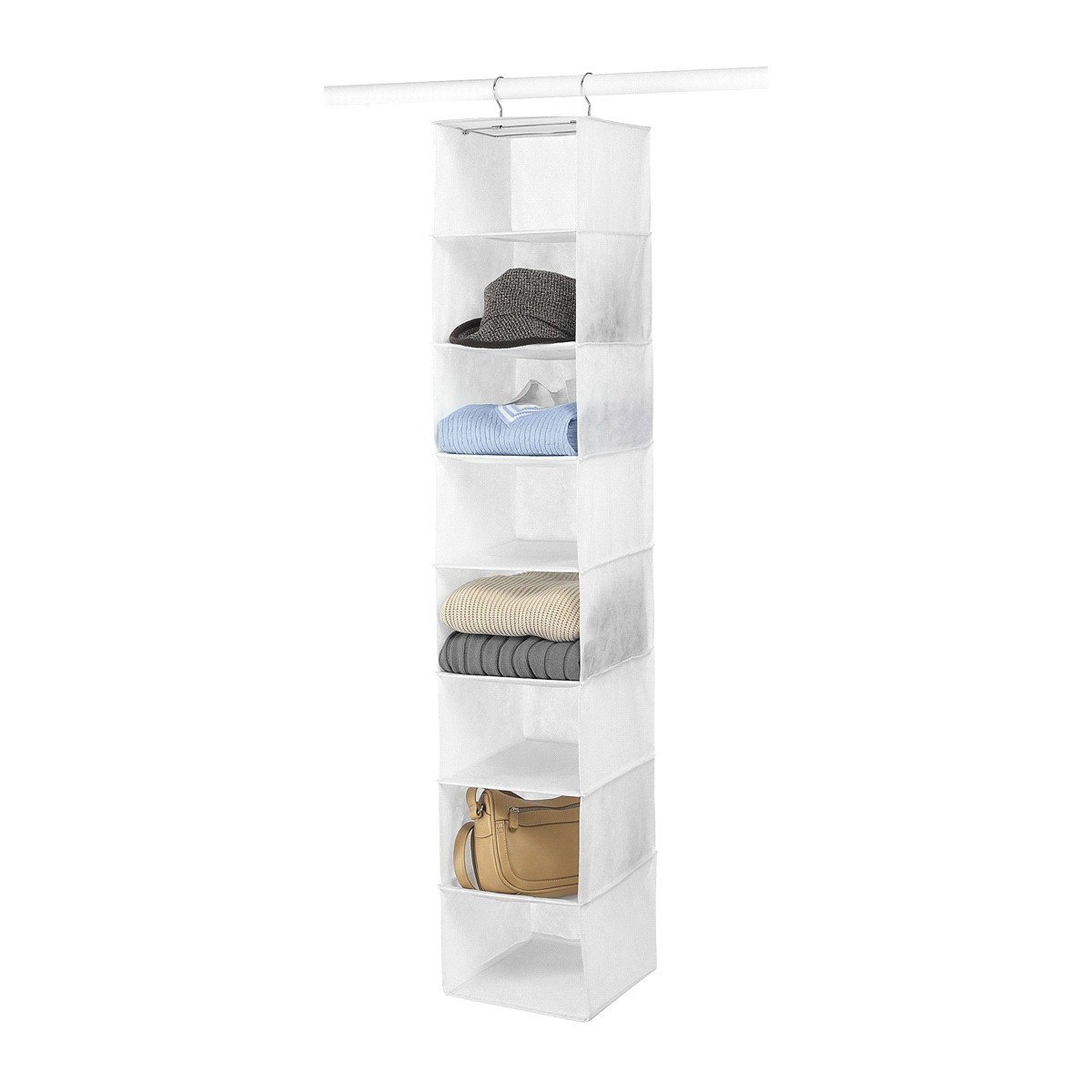 Whitmor's closet organizer has a sturdy metal frame that hangs from the closet rod. This hanging organizer has 5 easy access shelves to hold clothing, shoes, scarves or accessories.