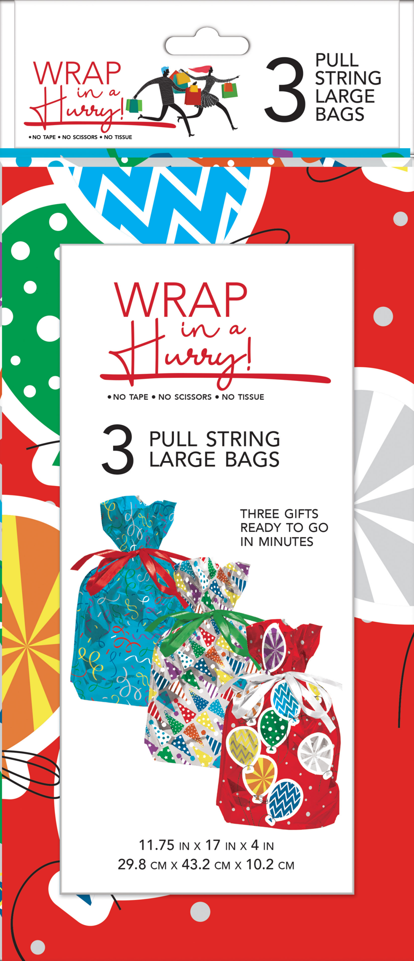 These Wrap-In-a-Hurry large pull string sacks are a perfectly easy way to wrap gifts in seconds. Each pack offers three fun contemporary everyday designs and with coordinating built in satin string to…