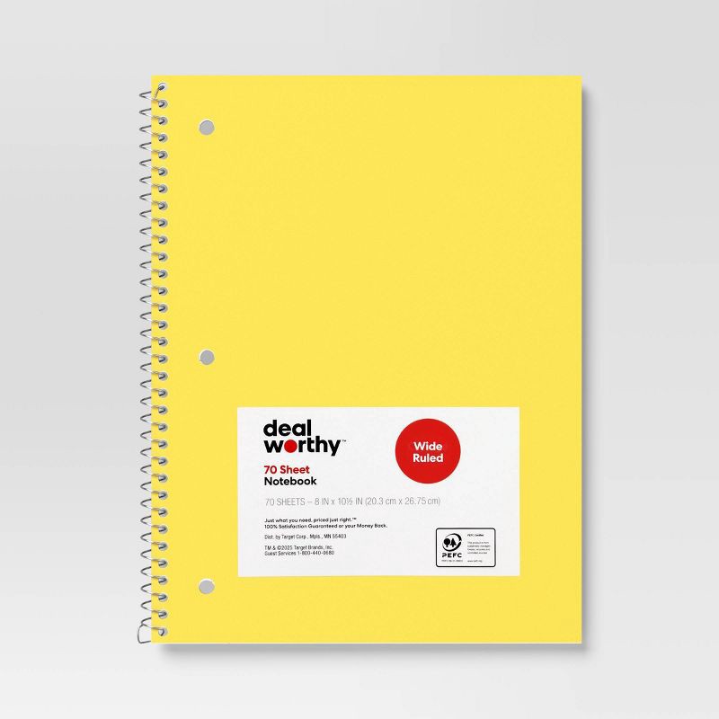 Stay organized and ready to jot down notes with the Wide Rule Spiral Notebook Yellow from dealworthy™. Featuring 70 perforated, wide-ruled pages, this notebook ensures clean and easy tear-out for effo…