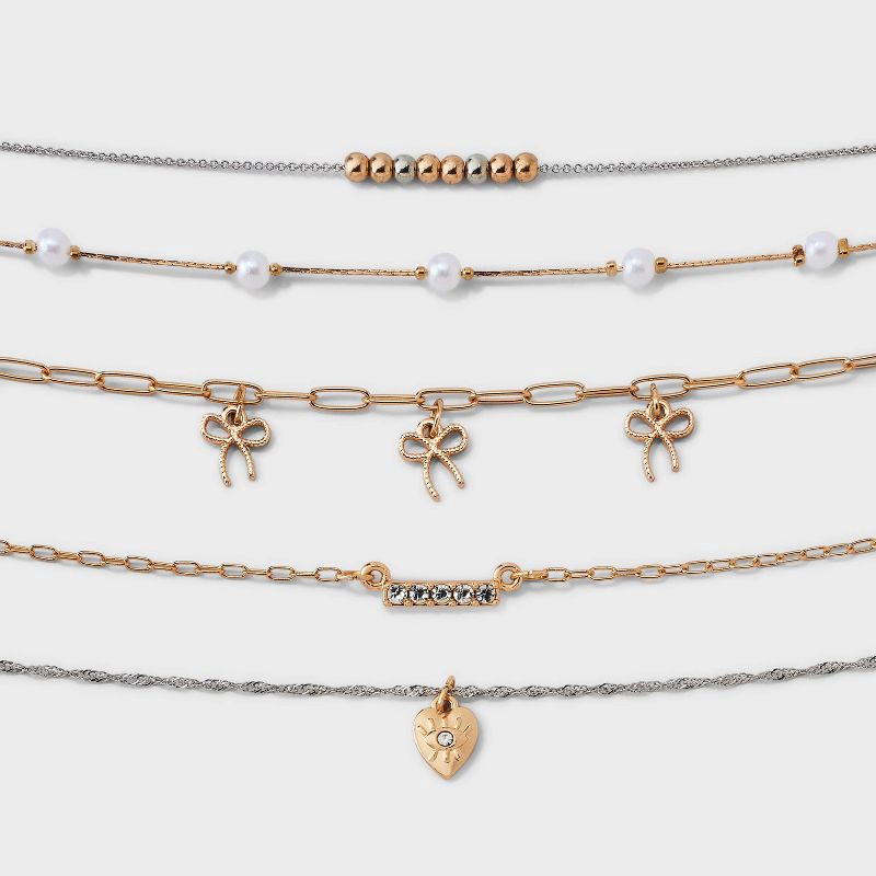 Five-Piece choker necklace set from Wild Fable™ in silver and gold-tone hues. Varying designs range from faux pearls to bow and more. Lobster claw clasp closures along with extender chain help you fin…