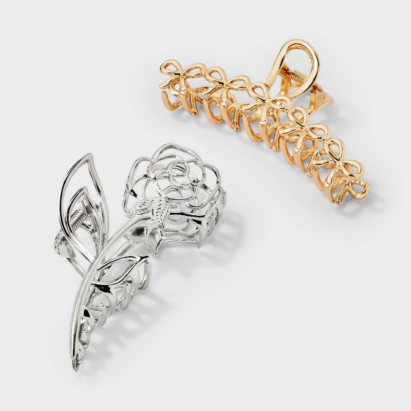 2-Piece claw hair clip set from Wild Fable™ includes one in silver with rose detailing and one in gold-tone with bow detailing. Great for styling and securing hair. Suitable for all hair types. If you…