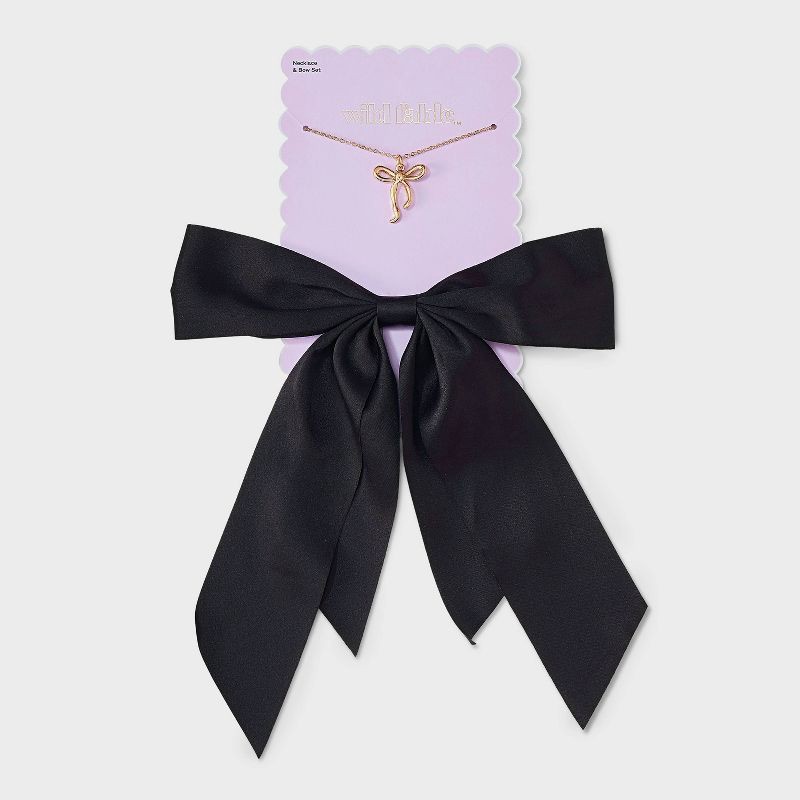 Two-piece bow hair clip and necklace with bow charm Set from Wild Fable™ . Includes a hair barrette with a black fabric bow featuring trailing ties plus a gold-tone rolo chain necklace with a matching…