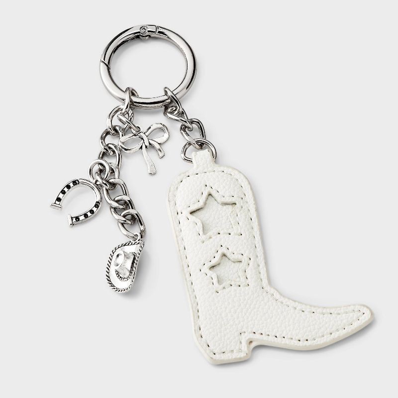 Game Day boot handbag charm from Wild Fable™. Designed as a Western-style boot in red with stars. Also features silver-tone cowboy hat, horseshoe and bow charms. Clip-on ring makes it easy to attach t…