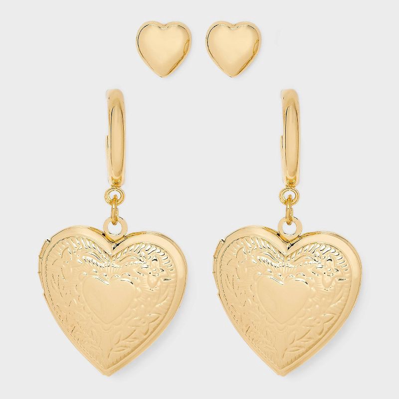Heart locket hoops and studs set from Wild Fable™ in gold-tone finishes. Includes two pairs of earrings — heart-shaped studs and open-hoop earrings with dangling heart-shaped lockets that can be opene…